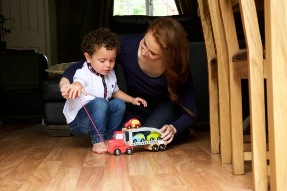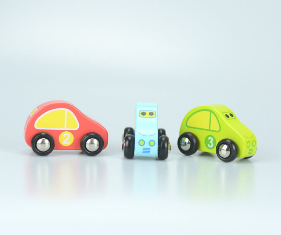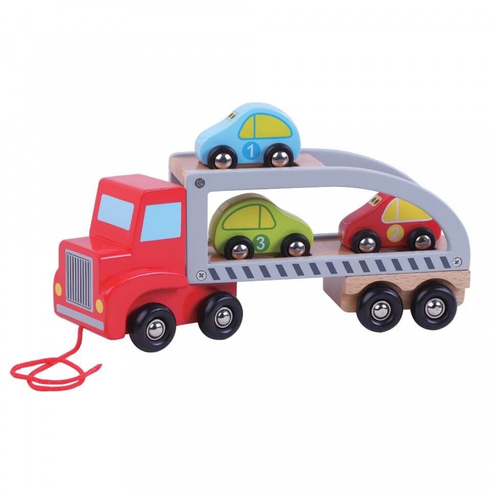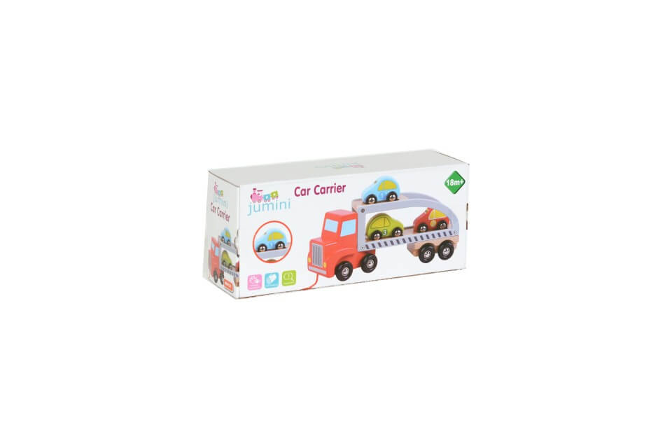 Camion de transport cu trei masini din lemn, aceasta jucarie ajuta la dezvoltarea creativitătii celor mici.
